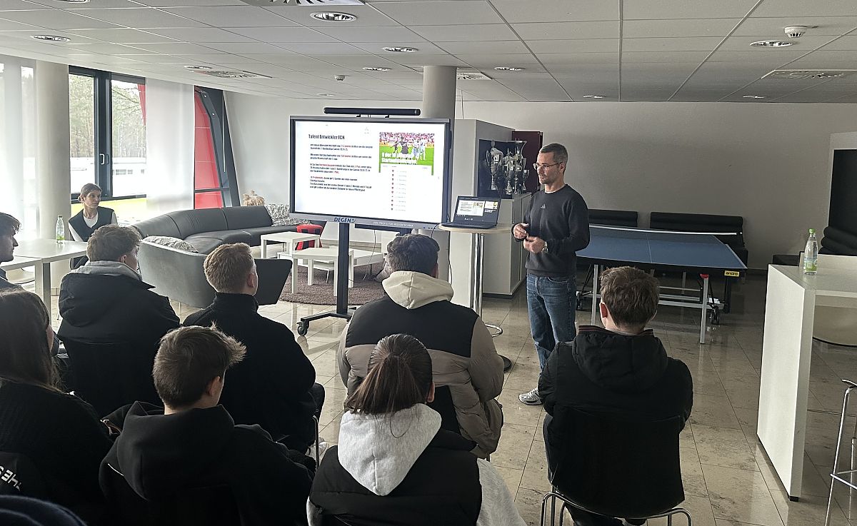 Im Rahmen einer informativen Präsentation wurden die Organisation und Struktur des NLZs vorgestellt und es gab spannende Einblicke in die erfolgreiche Nachwuchsarbeit des Vereins. Dabei wurde deutlich, wie vielschichtig und anspruchsvoll die Förderung junger Talente ist – sowohl auf sportlicher als auch auf persönlicher Ebene. Neben Trainingsinhalten und Leistungsentwicklung standen insbesondere pädagogische Aspekte sowie der verantwortungsvolle Umgang mit Jugendlichen im Fokus.