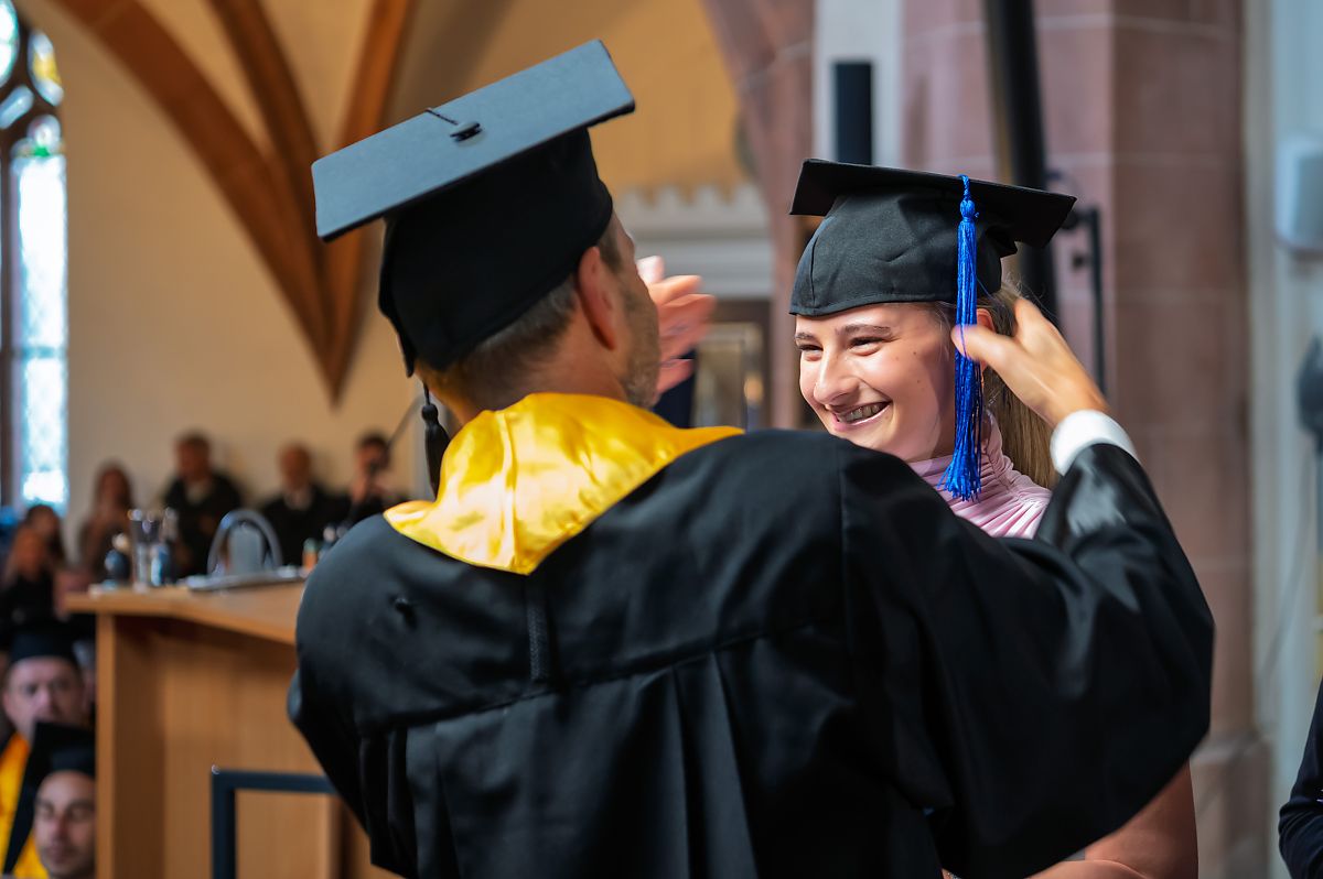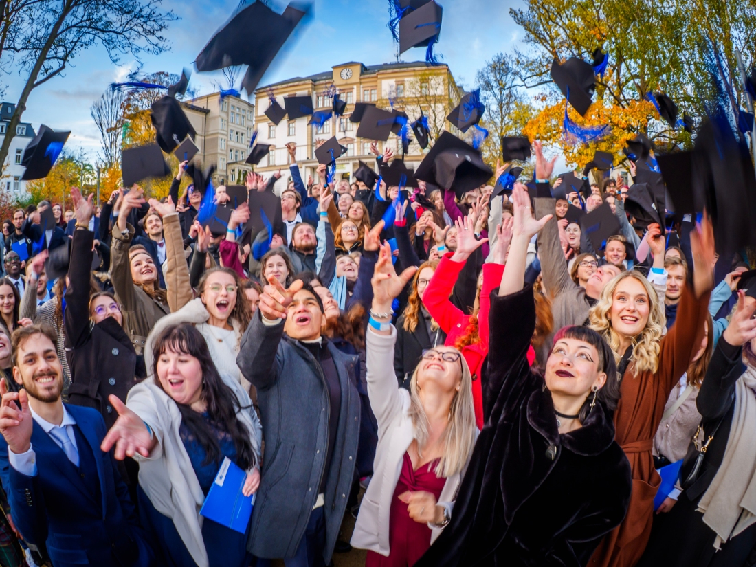 Rektor Prof. Dr. rer. oec. Volker Tolkmitt vollzog den berühmten "Rausschmiss" der Absolvent*innen und beglückwünschte sie zu ihrem verdienten und erfolgreichen Abschluss.