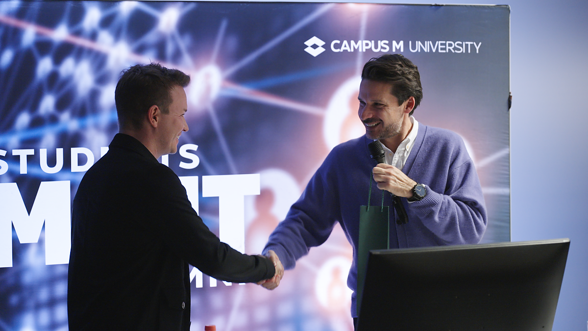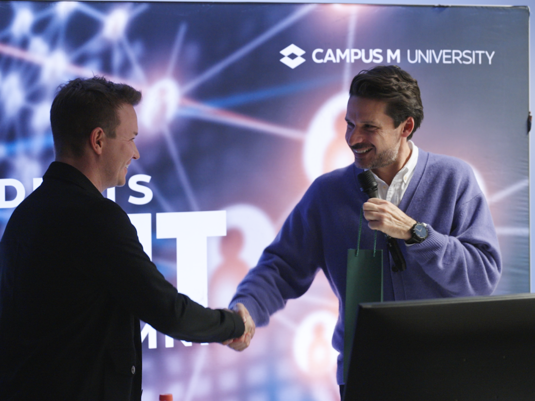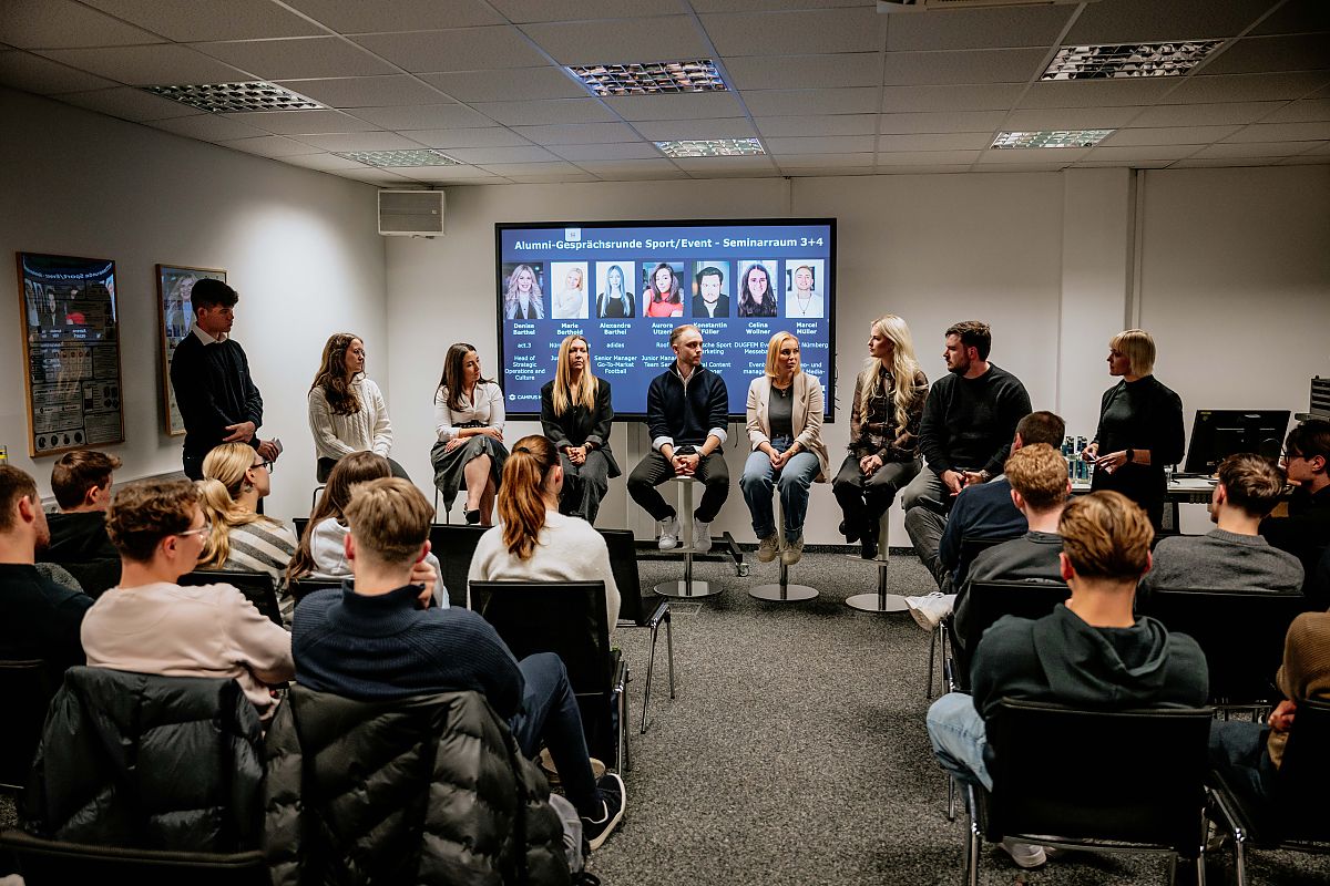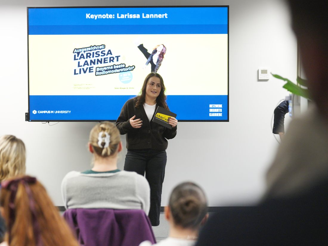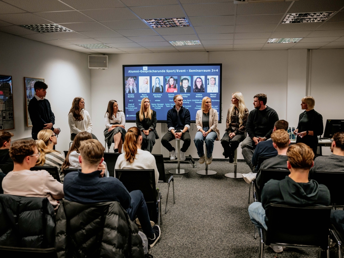 Die Alumni-Runden an beiden Standorten boten den Studierenden die Möglichkeit, sich direkt mit Absolventinnen und Absolventen der Campus M University auszutauschen. In kleinen Gesprächsrunden berichteten die Ehemaligen von ihren beruflichen Erfahrungen – unter anderem bei Mercedes-Benz, dem FC Augsburg, Moët Hennessy, act³ oder dem 1. FC Nürnberg.