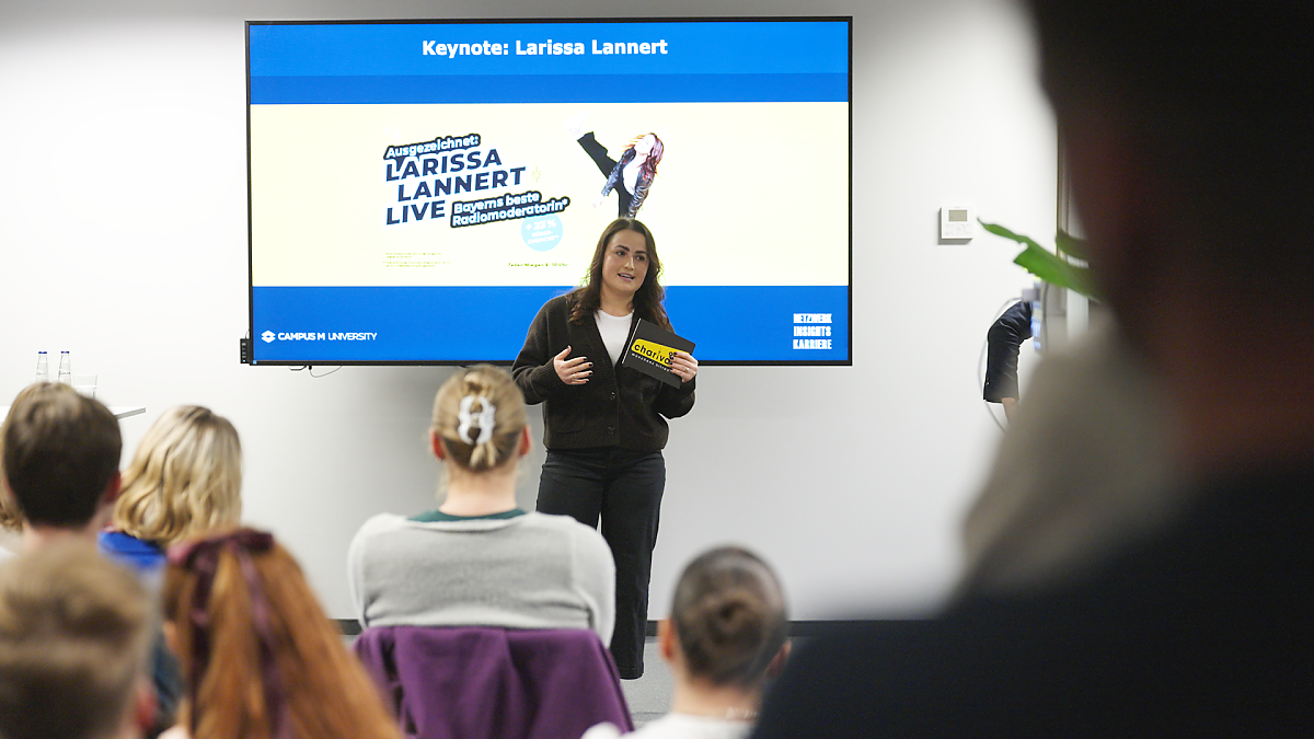 Parallel begrüßte Larissa Lannert, preisgekrönte Morning-Show-Moderatorin bei 95.5 Charivari, die Teilnehmenden bei einer zweiten Keynote-Session. Sie reflektierte ihre bisherige Karriere im Entertainment-Bereich und erläuterte, wie und warum sie 2024 mit dem Deutschen Hörfunkpreis ausgezeichnet wurde.